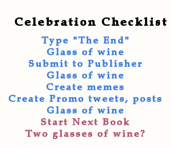 So as far as how I celebrate ending a manuscript? I don't. There is no reason to do so, no reason to party unless I'm spending money to host a launch. And I mean a real one with drinks, and guests and all. What a minute. That means I'd have to know people to invite.