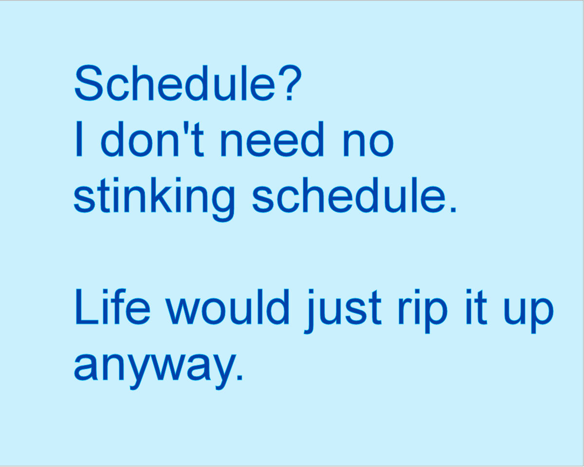 Managing is often synonymous with scheduling. My to do list is at the whim fate and the control of others. My idea of "me time" is a quick shower or a few hours of sleep. When I do schedule specific time, the Peter Principle will come into play and a emergency will take precedence.