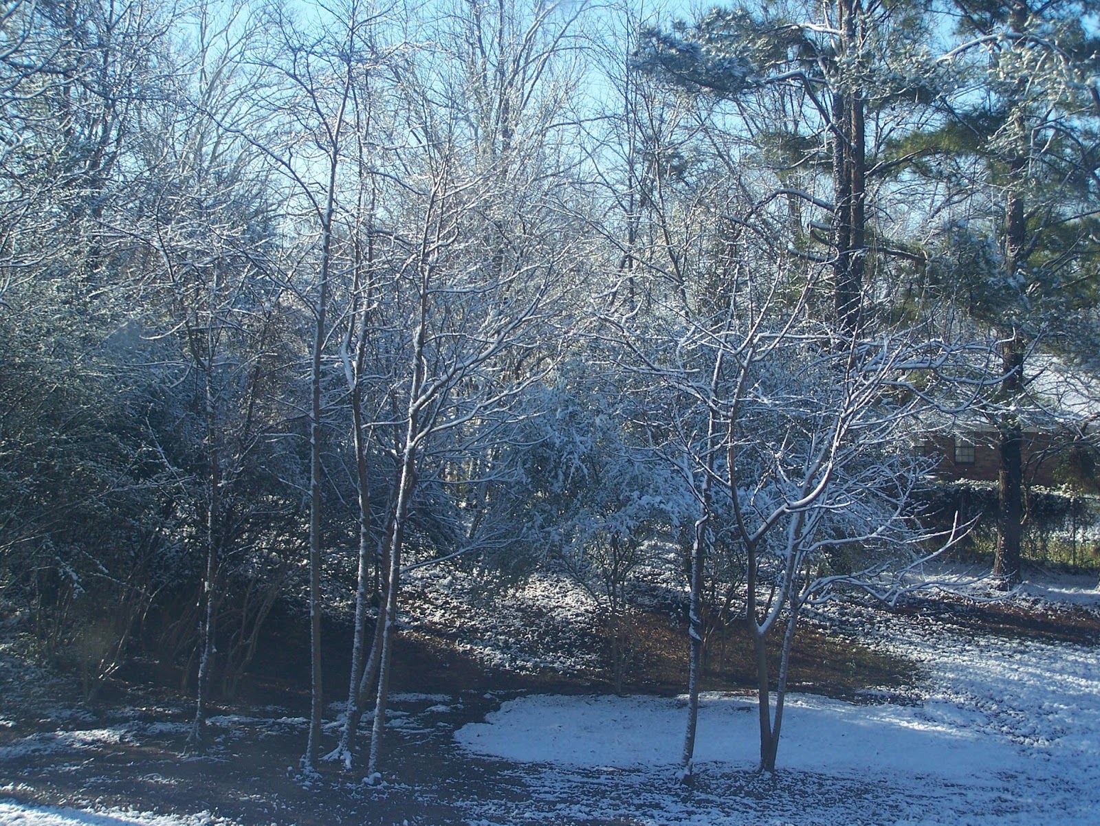 After 30 plus years of in-town living, a shaded yard (landscaping to follow) showcases natures beauty in a rare snowfall.