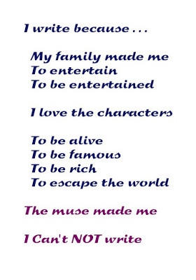 Sometimes there is one answer to the question, other days the question is more of a negative, "Why am I writing?" This post is going to be short. No lessons, no advice to new writers. Not even an answer to the second question as to why I am still writing.