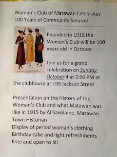 Special events and anniversaries provide a unique view into the past of an area. And the way an event is commemorated (or not) provides insight as well. An advantage is that at anniversary events such as the one October 4th celebrating 100 years of community service by the Woman's Club of Matawan memories are at the forefront.