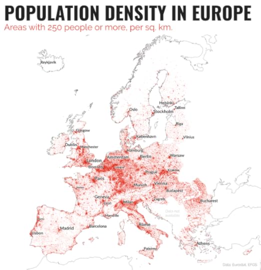 "It’s often said that England is the most densely populated large country in Europe – typically in discussions about the nation’s rising population, and the growing strain on public services. But it’s not true...In fact, Spain could claim to be the most densely populated major European country by this measure, despite its appearance on the map. This also helps explain why Spain has the most densely populated km² in Europe; more than 53,000 people inhabit a single 1km² area in Barcelona..."