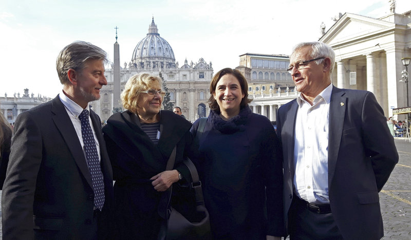 [Colau with her counterparts from Madrid, Zaragoza and Valencia at the Vatican. Photo: EFE.]"The mayoress of Barcelona, Ada Colau, yesterday [restated] the role that cities can play in the reception of refugees in contrast with the “disastrous handling” so far of the states and the international community in the face of the crisis.