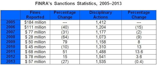 Anybody still wondering why Wall Street likes being a self-regulated industry? Is Wall Street this clean or are the regulators little more than meter maids as I have long maintained? Well, thanks to the folks at Sutherland Asbill & Brennan let’s look at the fines imposed by FINRA last year and over the last 9 years (including the years prior to FINRA’s formation in 2007 as a result of the merger of the NASD and the regulatory arm of the NYSE):