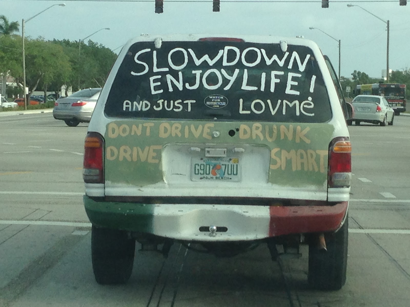 Life's little instruction book summed up on the back of this SUV.How can you not love them?