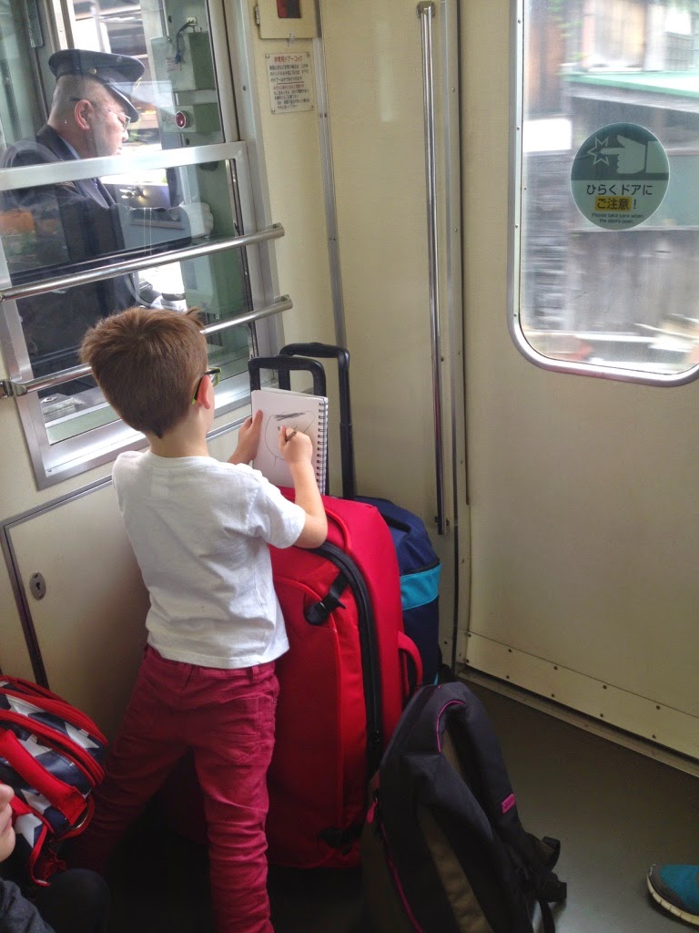 The train ride from Hakone back to Tokyo, where my 4-year old son set up a makeshift easel on our luggage and did some drawings.