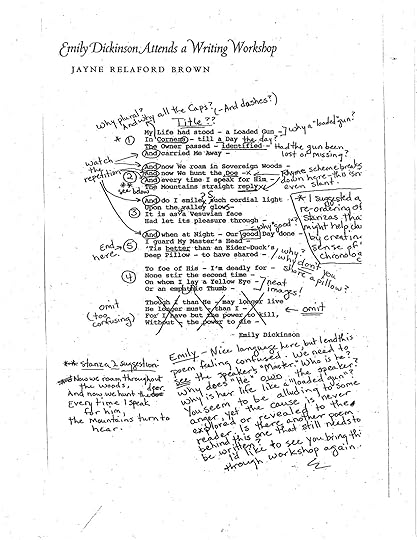 The desecration of the Dickinson poem as seen above, commonly happens in writer workshops. Never mind the fact that poor Emily, had she ever been so ruthlessly assessed by a room of strangers, may not have ever written another poem in her life, and American poetry would've suffered a sad loss. (Or she did attend workshop and that is why she became such a recluse!).
