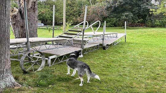 Cool water. Light waves. My buddy, Astro the Husky, watched from the porch. Bluejays and chickadees kept busy at the feeders. Neighbors two houses down grilled meat. Not many boats out. Long stretches of cottony clouds across the sky. And I only swore a few times—drill battery went dead, dropped a wrench in the lake. Overall, it felt good. Pulling, twisting, lugging, lifting. It was late afternoon. Quiet. I had nothing else to do. So, I got all five of the ten-foot sections up and over the break wall. One by one. Stacked and lined them up under the cedars for easy set up next year.