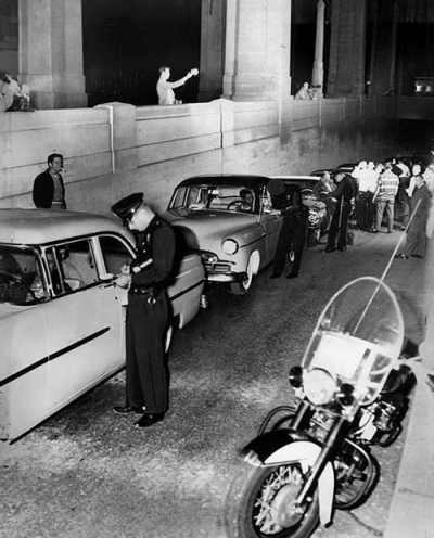 MARCH 6, 1955...TASK FORCE UNITS SURROUND TEENAGERS DRAG RACING IN THE L.A. RIVER CULVERT NEAR THE 6TH STREET BRIDGE...