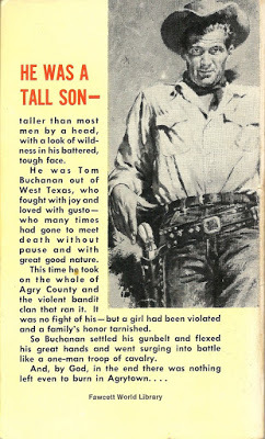 There is always an abundance of shapely widows, daughters and dancehall girls to keep Buchanan from getting bored. The mean streets of the city have been replaced by dusty main streets, and the private eye by the itinerant gunslinger, but the code of the white knight remains the same.