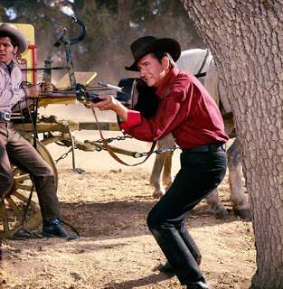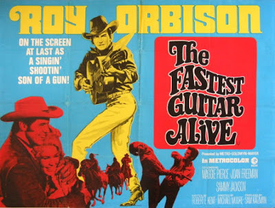 If played as a straight Western, the plot of the movie is intriguing. In some ways it’s a twist on the Errol Flynn/Randolph Scott western Virginia City, with which it shares a number of similarities. Johnny Banner (Orbison) is a Confederate spy posing as roving musician. With the gimmick of a gun hidden in his guitar, he’s sort of a guitar-slinging, singing, gunslick. Banner’s sidekick, Steve Menlo (Sammy Jackson), poses as the proprietor of Dr. Ludwig Long's Magic Elixir traveling medicine show. This supposedly allows him to wander into the same places as Banner without drawing suspicion.