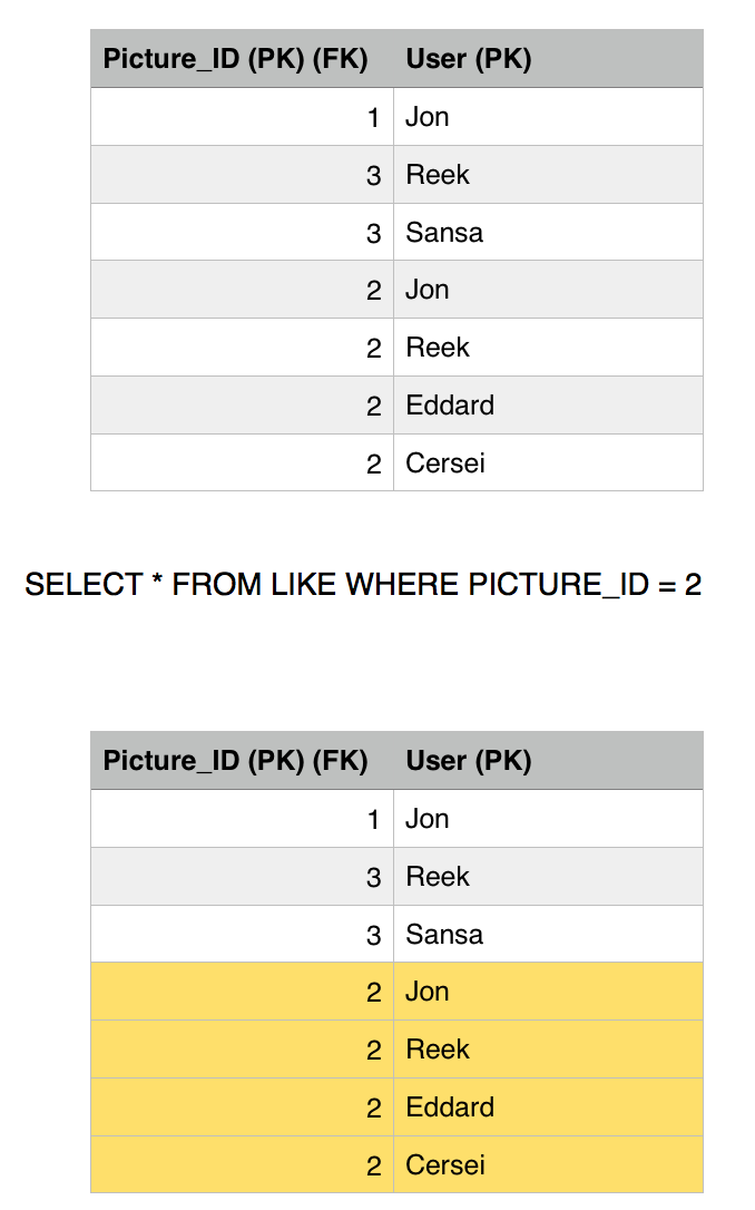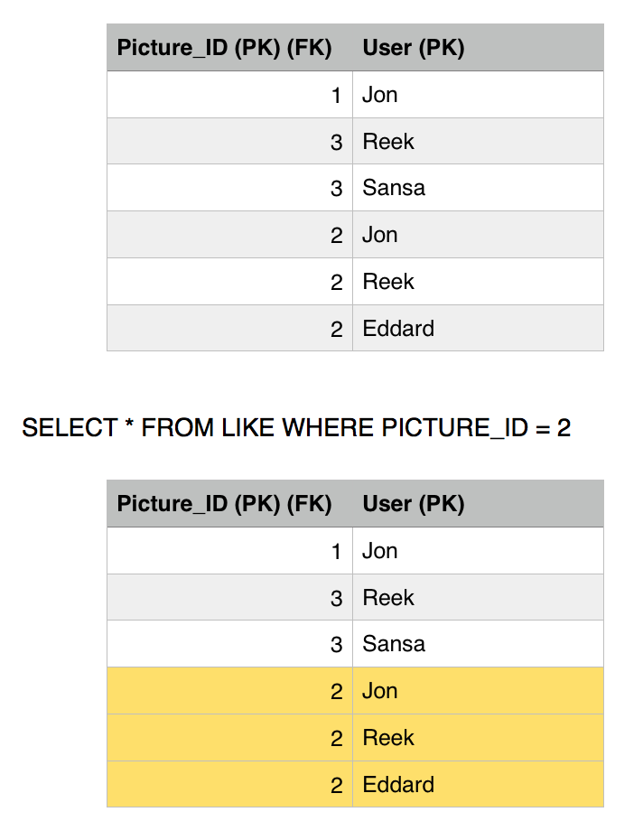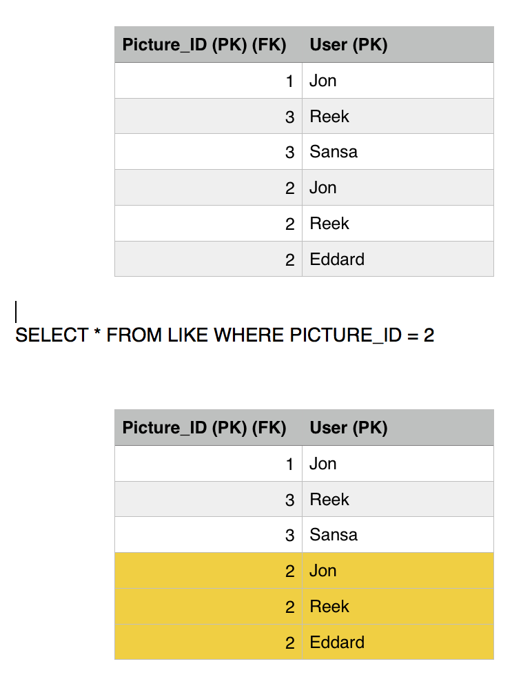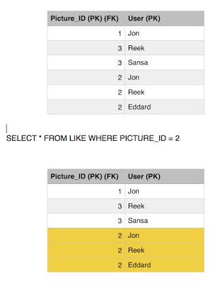 Sansa issues another read to the Like table to get all the users who likes picture 2, she gets two rows, Jon and Reek. Consistent with the number of likes she got.