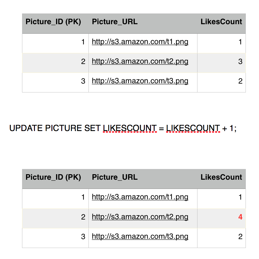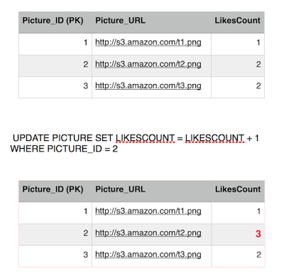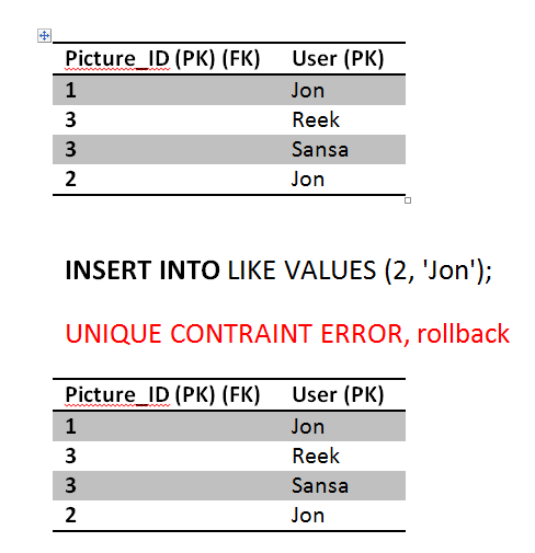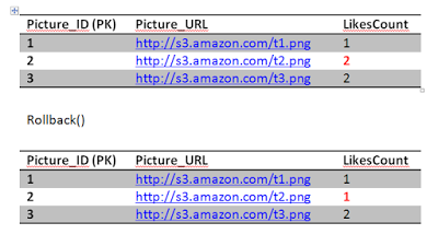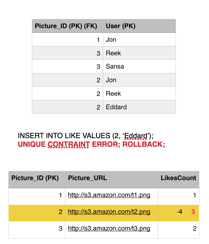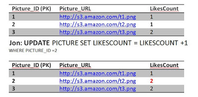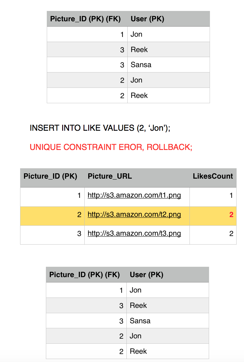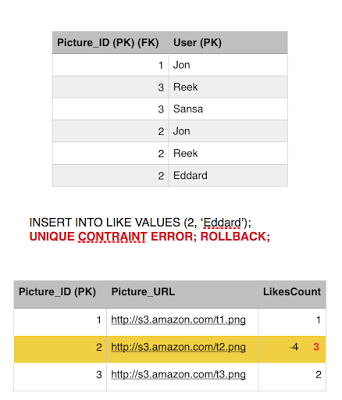 AtomicityAssume Jon, when he is not guarding the Wall, likes Picture 2. That is equivalent to one update query to the Picture table to increment the count of likes by 1 and one insert query to add a row in the Like table.