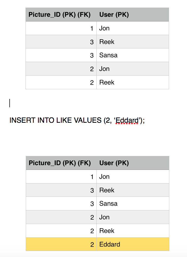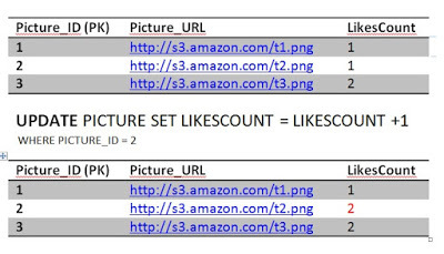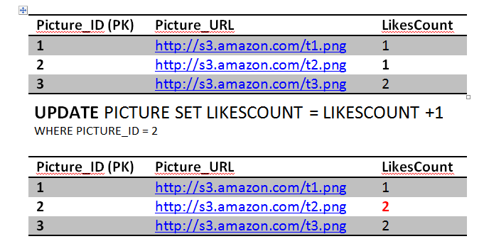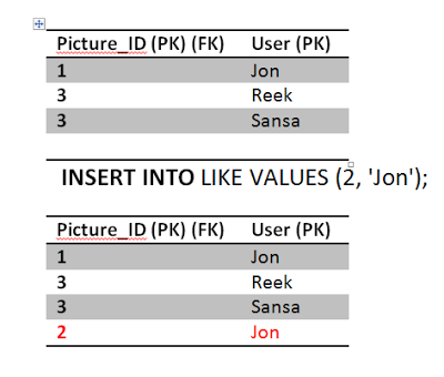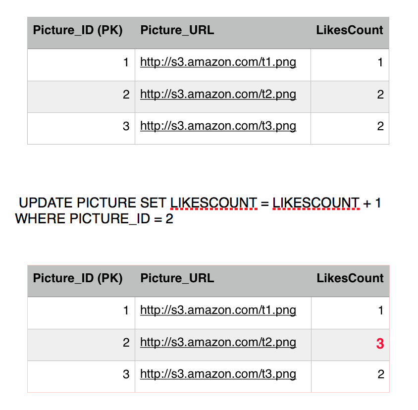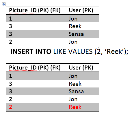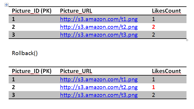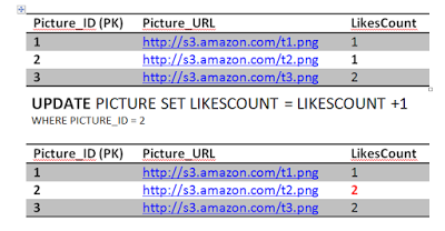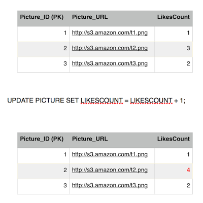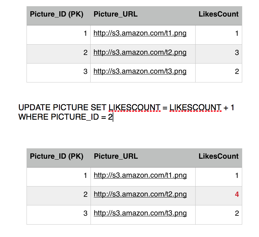 AtomicityAssume Jon, when he is not guarding the Wall, likes Picture 2. That is equivalent to one update query to the Picture table to increment the count of likes by 1 and one insert query to add a row in the Like table.