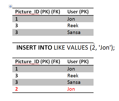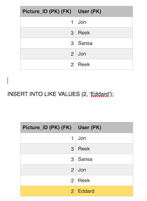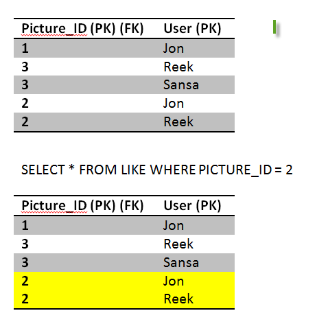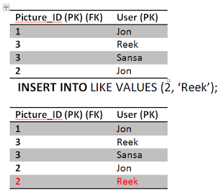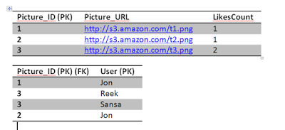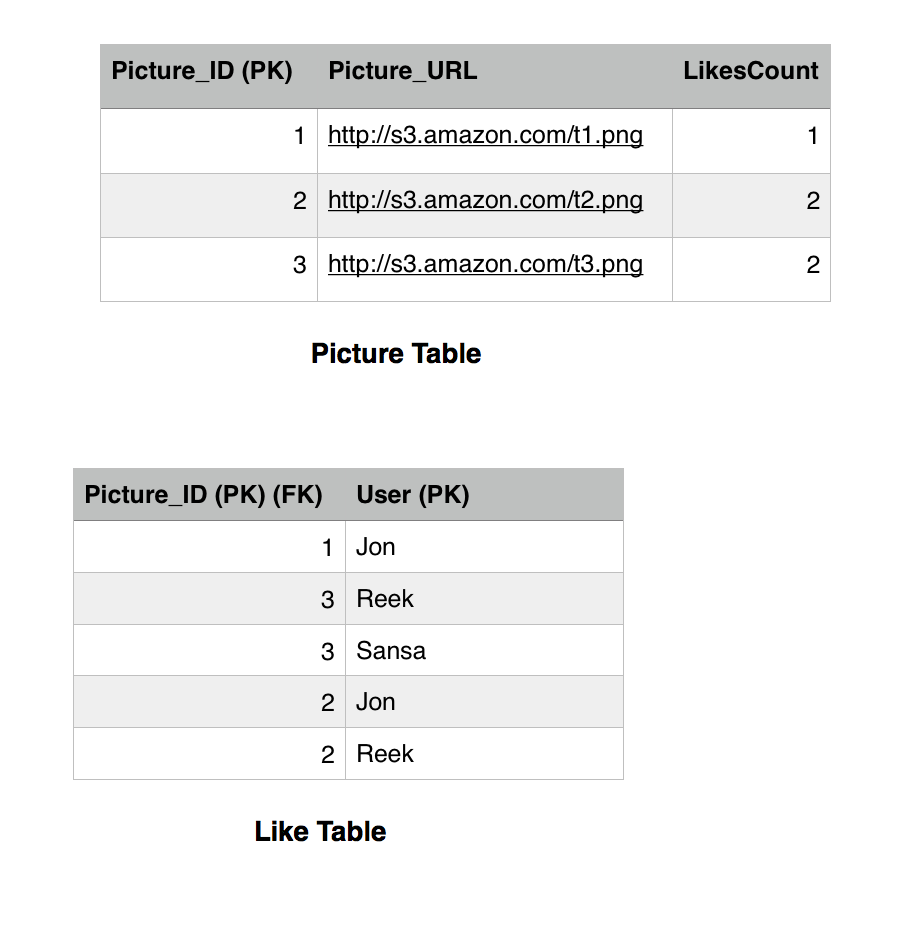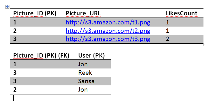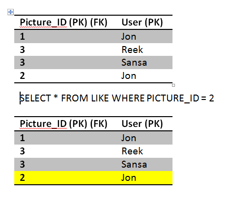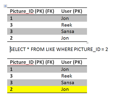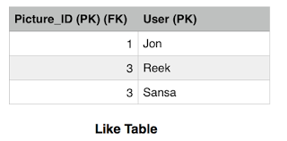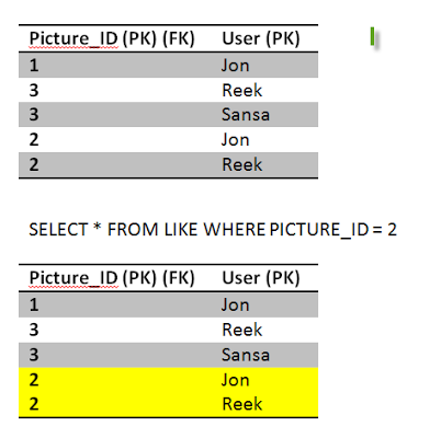 Brief recap, the Picture table has the LikesCount field which keeps track of how many likes a picture got. This is a performance tweak in order to avoid querying the Like table every time we want to get the likes count for a picture. We notice that picture 1 has 1 like only by Jon and picture 3 has two likes by Reek and Sansa. Picture 2 has 2 likes by Jon and Reek. The Picture_ID is the primary key in the Picture table, while both the Picture_ID and the User constitute the primary key for the Like table. There are many fields that we can add but for simplicity we are sticking with these now.