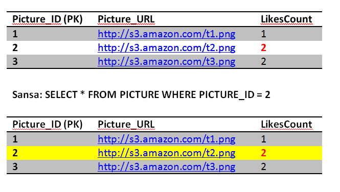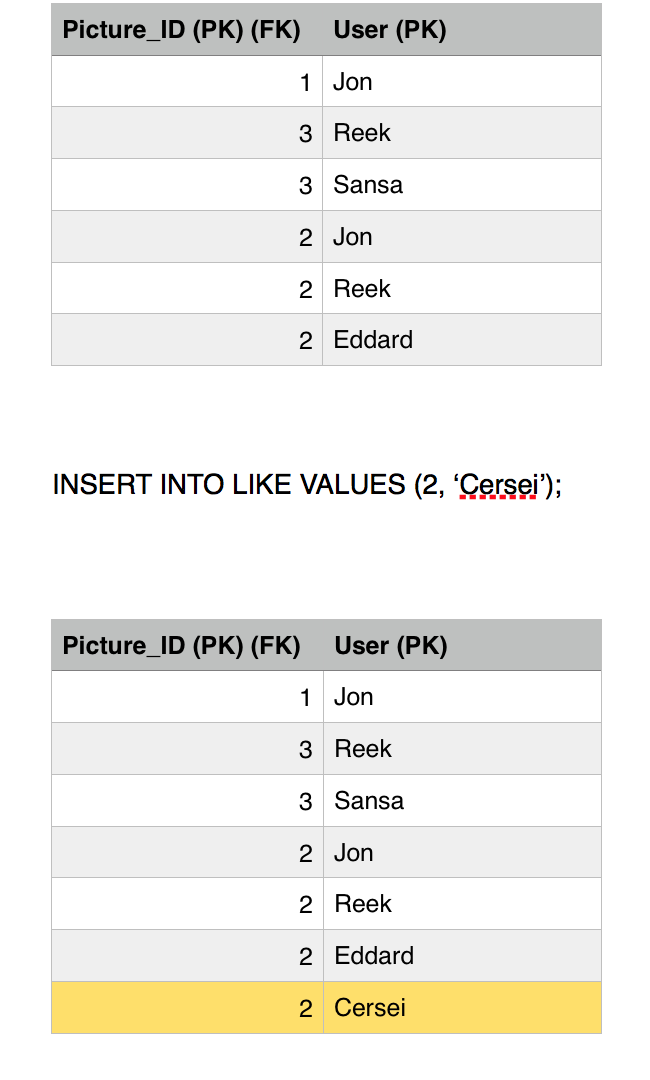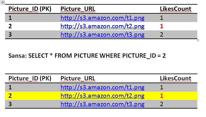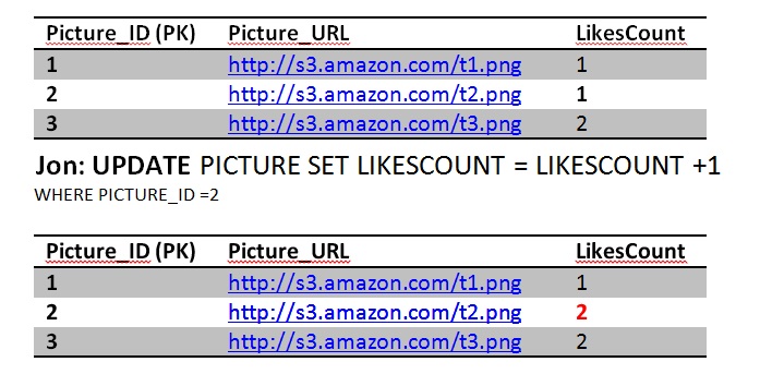 Sansa issues another read to the Like table to get all the users who likes picture 2, she gets one row, which is Jon. Inconsistent with the number of likes she gets hmmm.