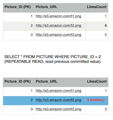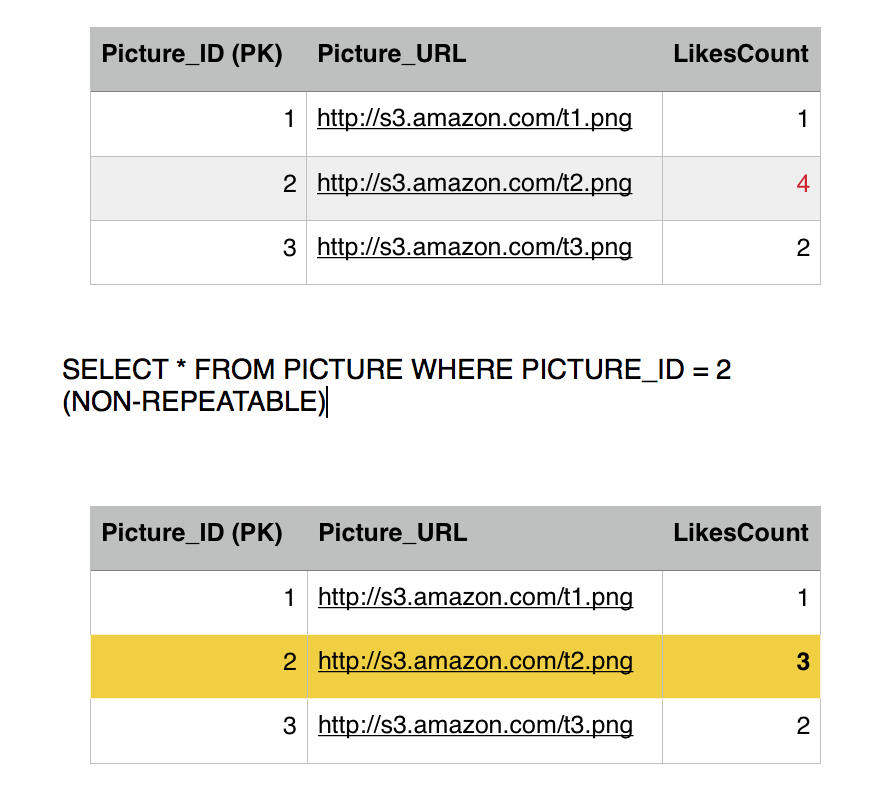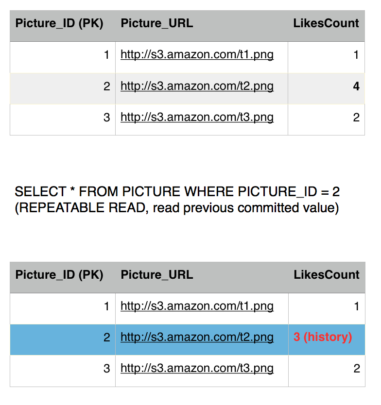 Sansa's transaction is still running she is querying other tables, doing some stuff, updating the view count perhaps, and then finally, she comes back for a final read of picture 2 getting the likes count. Although the final committed value is 4, Sansa is going to get the original committed value when her transaction began which was 3. So we avoided getting the non-repeatable read phenamona with Repeatable read isolation level. It is slightly expensive since we have to keep history of versions of each committed values and go back searching for a previous value with a timestamp.
