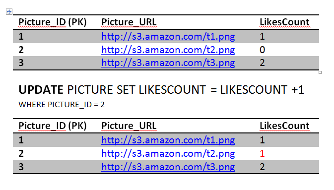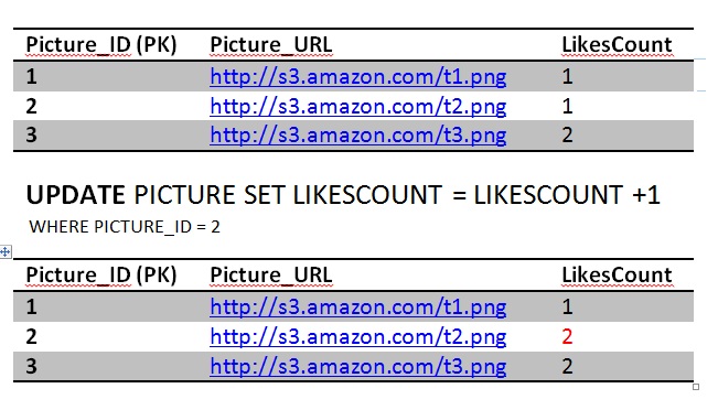 UPDATE PICTURE SET LIKESCOUNT = LIKESCOUNT +1 WHERE PICTURE_ID = 2;