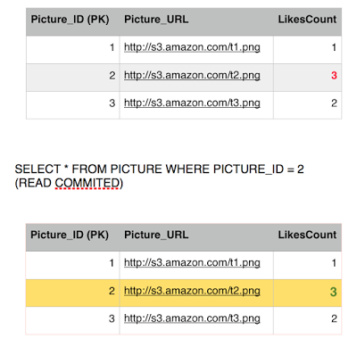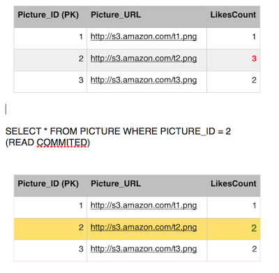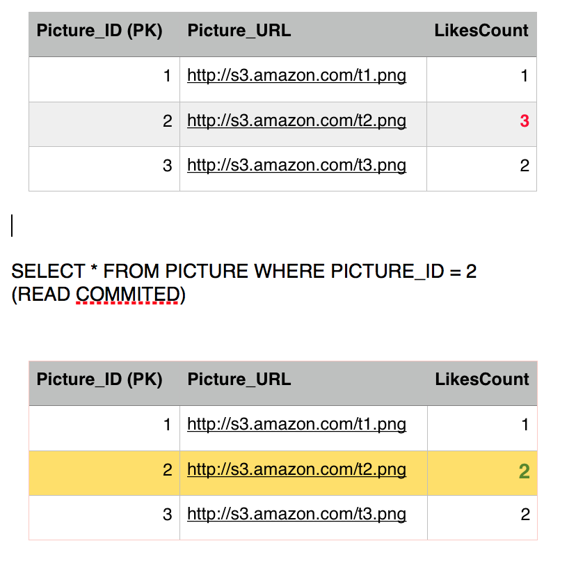 Read CommittedThis isolation level offers isolation against uncommitted reads. A transaction will only read entries that has been committed by other transacations. So from this definition we know that dirty reads phenomena cannot appear in this isolation level. But again, we need a good example that illustrates this. Lets do our Instagram example again.