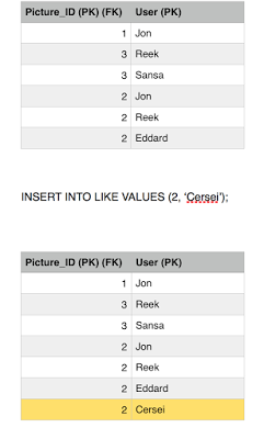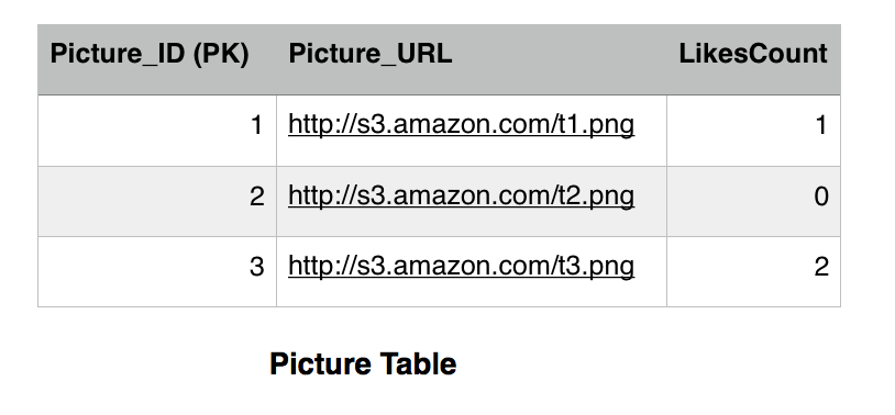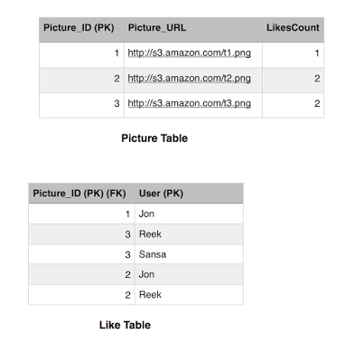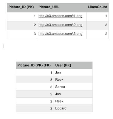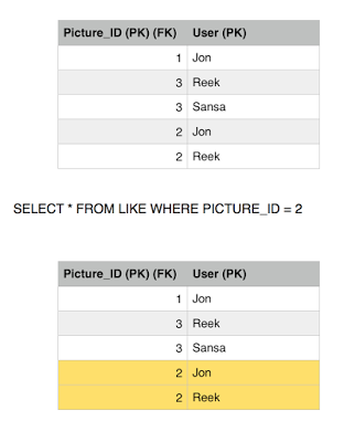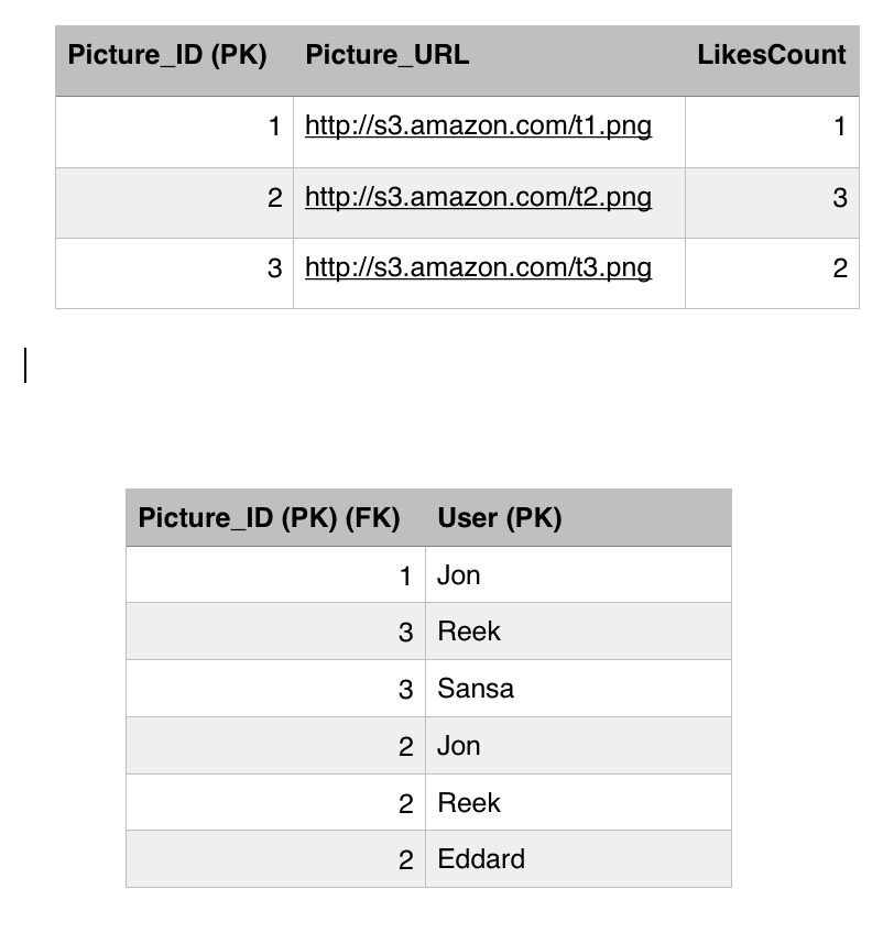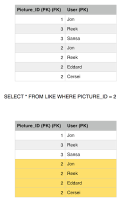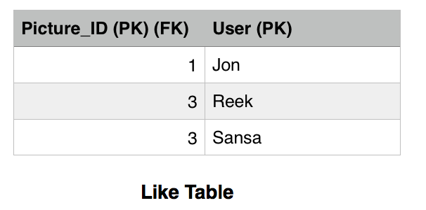 Brief recap, the Picture table has the LikesCount field which keeps track of how many likes a picture got. This is a performance tweak in order to avoid querying the Like table every time we want to get the likes count for a picture. We notice that picture 1 has 1 like only by Jon and picture 3 has two likes by Reek and Sansa. Picture 2 has 1 like by Jon. The Picture_ID is the primary key in the Picture table, while both the Picture_ID and the User constitute the primary key for the Like table. There are many fields that we can add but for simplicity we are sticking with these now.