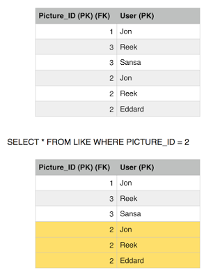 Sansa issues another read to the Like table to get all the users who likes picture 2, she gets three rows, Jon, Reek and Eddard. Consistent with the number of likes she got.