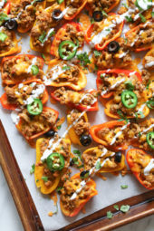 With Superbowl happening this weekend, I thought these would make a lighter alternative to traditional nachos. Mini rainbow bell peppers are the perfect size for eating with your hands, but heck, you could even make this for lunch or dinner and call it a meal! These are so good, and picky-husband approved!