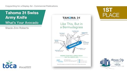 Once again, What’s Your Avocado? Marketing & Public Relations and its founder, Stacie Zinn Roberts, has been recognized for award-winning marketing campaigns on behalf of national clients. At the 2022 Turf & Ornamental Communicators Association (TOCA) Awards held in early May in Kansas City, What’s Your Avocado? won three national awards, including the equivalent of Best in Show for’ marketing campaigns on behalf of client Tahoma 31 Bermudagrass, developed by researchers at Oklahoma State Univeristy.