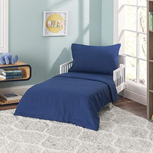Everyday Kids 4 Piece Toddler Bedding Set - Includes Comforter, Flat Sheet, Fitted Sheet and Reversible Pillowcase - Solid Navy