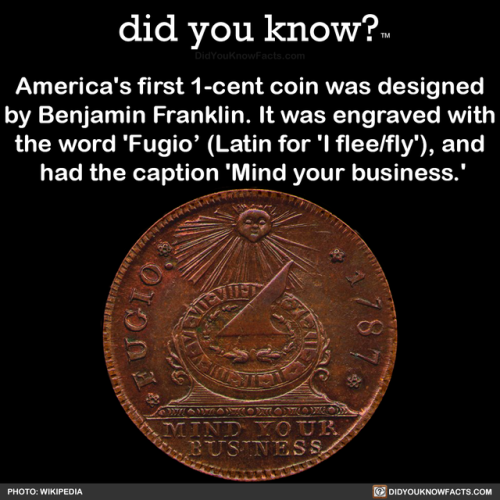 America’s first 1-cent coin was designed by Benjamin Franklin. It was engraved with the word ‘Fugio’ (Latin for ‘I flee/fly’) and had the caption 'Mind your business.’ Source Source 2 Source 3