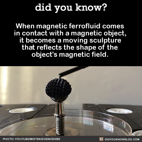 When magnetic ferrofluid comes in contact with a magnetic object, it becomes a moving sculpture that reflects the shape of the object’s magnetic field. Source