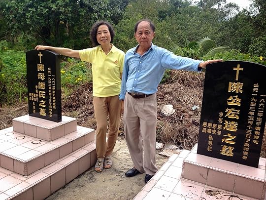 A cousin and I at the grave site in Buso, Sarawak, of our great parents who migrated from China. The inscription on the right tombstone, that of our great grandfather reads: "Born 1862 Guangdong Dongguan / Died 1943 May 15th Kuching"Before I answer this question, I must say I found it more interesting and alluring to write about a place with close family connections. I was thrilled to be at the sites where important and often calamitous events had occurred in the time periods of my story. My relatives in Sarawak made it possible and easy for me to go to those places time and again. My father’s village of Buso was one of the scenes where the massacre took place. And there I was, walking down its main street where blood had flowed profusely in 1857! I suppose in a way you can say it’s easier to write about a place with close family connections, because of the ready access to information and research, but then the poignancy of the subject matter made it emotionally more taxing and therefore harder for me to write about it.