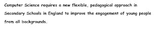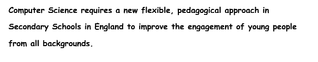 Computer Science requires a new flexible, pedagogical approach in Secondary Schools in England to improve the engagement of young people from all backgrounds.