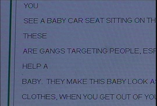 National Gang Week is starting: This is their new target method while driving on any roads, If you see a baby car seat sitting on the side of the road DO NOT STOP!!!! These are gangs targeting people, especially women, to stop their vehicle to help a baby. They make this baby look as if it has blood on itself or on its clothes, when you get out of your vehicle in attempt to help, the gangs jump out from cornfields or tall bushes. They have beaten women to near death, and then continue to rape them with baseball bats and other torture methods. This is not just a forward of information, it is within our area. If you do happen to see a car seat DO NOT STOP CALL THE POLICE IMMEDIATELY!! Please send this onto everyone you know.
