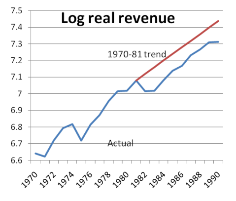 But wait! Even that increase is wildly misleading. After all, the United States is going to experience population growth and economic growth under virtually any income tax regime. Real tax revenue will grow if you keep the tax laws unchanged. (So will expenditures, for the same reason.) So to figure out what Reagan did to revenue, you need to compare it to the trend. Fortunately, Paul Krugman has done that for us: