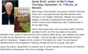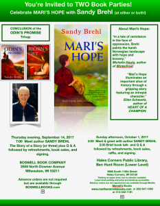 The official Launch event for Mari’s Hope will be Thursday evening, Sept. 14, at 7:00 at the amazing BOSWELL BOOK COMPANY in Milwaukee. I hope to see old friends there, make news ones, and share the story behind the creation of this trilogy. If you’re not able to come, will you pass the news on to others? There will be refreshments and a raffle, too!