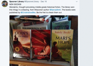 So, I offered a giveaway of the full trilogy in a previous post. Eva Apelqvist nominated Spooner Memorial Library, which was the randomly selected winner.