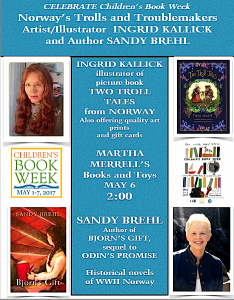 On Saturday, May 6, at 2:00, I’ll join talented artist/illustrator INGRID KALLICK at Martha Merrell’s Books and Toys in Historic Downtown Waukesha. Our program is titled: TROLLS AND OTHER TROUBLEMAKERS from NORWAY.