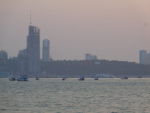 its cranes, yellow, splashed by the sea.