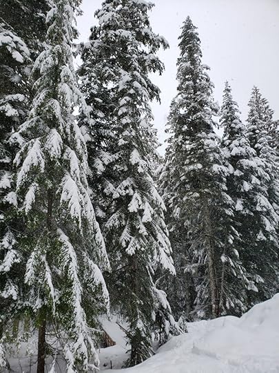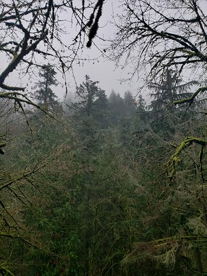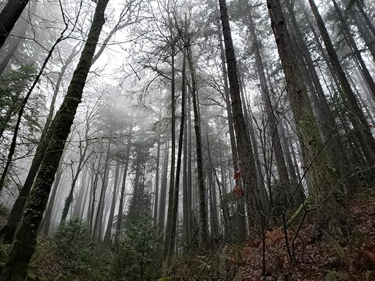 In the darkness, the air begins to smell of drops of water on fallen needles, and rain pulled densely into moss, startled like glass. Can you hear it, there, the shifting of the old mountains underfoot, slumped by wind and the slow trickle of water, the clay skin, the granite stones, the piles of old sea-beds muddled high–gray, forgotten ancestry? And as the wind blows downward, the dark of their green becomes something that watches you, night guardians who, somehow, you have always known; and you yearn for nights at firesides you have never seen, waking up to the dew and a gray sky that you know will give way to a soft tapping rain, one that will sink into you the same as the perfumed soil, and leave the streaks unbrushed on your forehead, in your eyelashes, like cedar webs, the pulse of the old ways, the ancient heartbeat of the wind sweeping long from the ocean, and the trees calling you, song-circles, cinnamon edges, sinking soils that hold up the world.