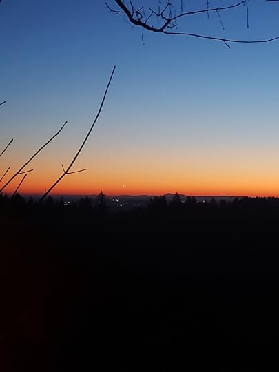 The cloud sea. Two crows bow to the pink edges. They perch on top of the Douglas firs, where the sun unfolds, seeping through as though salt from the sea. And the clouds move steadily–sloped mountainsides, saturated grey-blue: storms, far hills, still moments between waves.