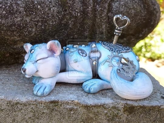 It's a clockwork arctic fox, and now that you've seen it, I'll have to hint at a spoiler from "Dangerous Science" if you are to know why this and the artist's creations overwhelm me with Happy. So let me just say that everyone should have a clockwork pet, especially one that purrs.