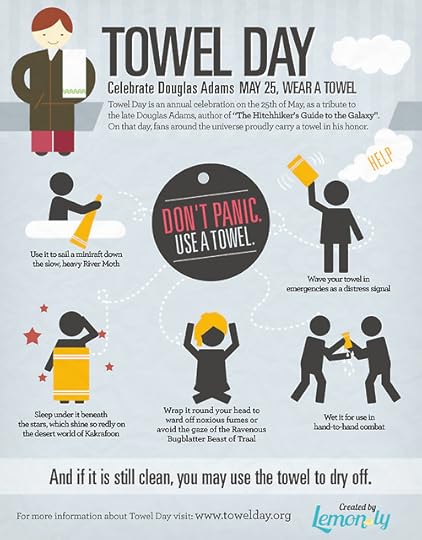 “A towel, [The Hitchhiker’s Guide to the Galaxy] says, is about the most massively useful thing an interstellar hitchhiker can have. Partly it has great practical value. You can wrap it around you for warmth as you bound across the cold moons of Jaglan Beta; you can lie on it on the brilliant marble-sanded beaches of Santraginus V, inhaling the heady sea vapours; you can sleep under it beneath the stars which shine so redly on the desert world of Kakrafoon; use it to sail a miniraft down the slow heavy River Moth; wet it for use in hand-to-hand-combat; wrap it round your head to ward off noxious fumes or avoid the gaze of the Ravenous Bugblatter Beast of Traal (such a mind-bogglingly stupid animal, it assumes that if you can’t see it, it can’t see you); you can wave your towel in emergencies as a distress signal, and of course dry yourself off with it if it still seems to be clean enough.