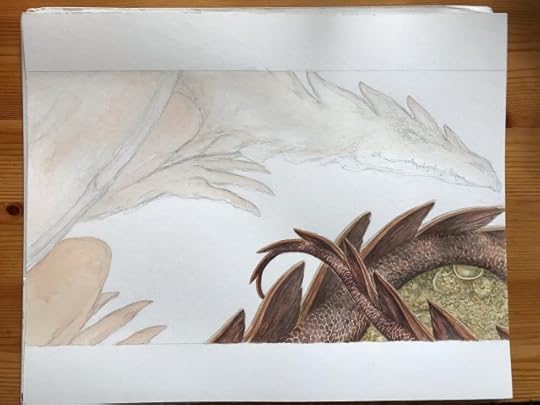 Working on a @fandomtrumpshate artwork – a watercolour of Smaug on his hoard – for @angiefsutton while listening to Dr. Amy H. Sturgis talk about Tolkien and ACD Sherlock and how their fandoms both encourage participation during #PPPMoot.