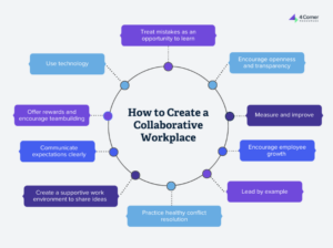 To foster a collaborative workplace, organizations can implement several effective strategies that enhance teamwork, communication, and overall productivity. Here’s a detailed breakdown of these strategies: