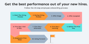 The Importance of OnboardingRetention Rates: Research indicates that nearly 90% of employees decide whether to stay with a company within the first six months of employment1. A well-structured onboarding program can significantly improve retention rates by making new hires feel welcomed and valued.Productivity: Employees who undergo formal onboarding processes are 8.5 times more likely to say HR is value-promoting compared to those who do not receive such training2. This suggests that effective onboarding directly correlates with quicker ramp-up times and enhanced productivity.Cultural Integration: Onboarding helps new hires acclimate to the company’s culture, which is crucial for their long-term success and satisfaction within the organization3.Steps for Effective OnboardingPre-Boarding ActivitiesEngagement Before Start Date: Begin engaging with new hires before their first day through welcome emails or packages that include company swag and important information about their role4. This helps build excitement and reduces anxiety.Paperwork Completion: Encourage new employees to complete necessary paperwork electronically before their start date to streamline the onboarding process on Day 15.First Day ExperienceWarm Welcome: Ensure that the workspace is prepared ahead of time, including setting up technology and providing necessary materials like ID badges or handbooks6. A warm welcome can set a positive tone for the entire onboarding experience.Structured Agenda: Provide a clear agenda for the first day that includes introductions to team members, an overview of company policies, and initial training sessions7.Assigning a Buddy: Pairing new hires with a buddy or mentor can facilitate smoother integration into the team by providing them with someone they can turn to for questions about culture or procedures8.Ongoing SupportRegular Check-Ins: Conduct regular check-ins during the first few months (e.g., at 30, 60, and 90 days) to assess how well the new hire is adjusting and address any concerns they may have9.Feedback Mechanisms: Implement feedback mechanisms such as surveys or informal discussions to gather insights from new hires about their onboarding experience. This information can be used to refine future onboarding processes10.Continuous Development: Transition from initial training into ongoing development opportunities after the first year, focusing on career growth and skill enhancement11.ConclusionIn summary, effective onboarding involves careful planning and execution across multiple stages—from pre-boarding activities through continuous support after hiring. By prioritizing this process, organizations can enhance employee satisfaction, reduce turnover rates, and foster a productive workforce.