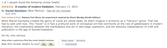 Which comes back to Baboon Fart Story. Reading the word "fart" for 200 pages may not be inherently enjoyable, but people liked it for a few reasons. They liked the ridiculousness of pee-pee and farts. They liked the contradiction of rampant ridiculousness living in a place where gatekeepers would typically kick it out. They liked what they believed that said about publishing in 2014. Best of all, they liked being a part of it all; the metadata for the book, rather than the book itself, was delightful. People's reviews (kindly archived by Kay Camden here) were the funniest part of the experiment.