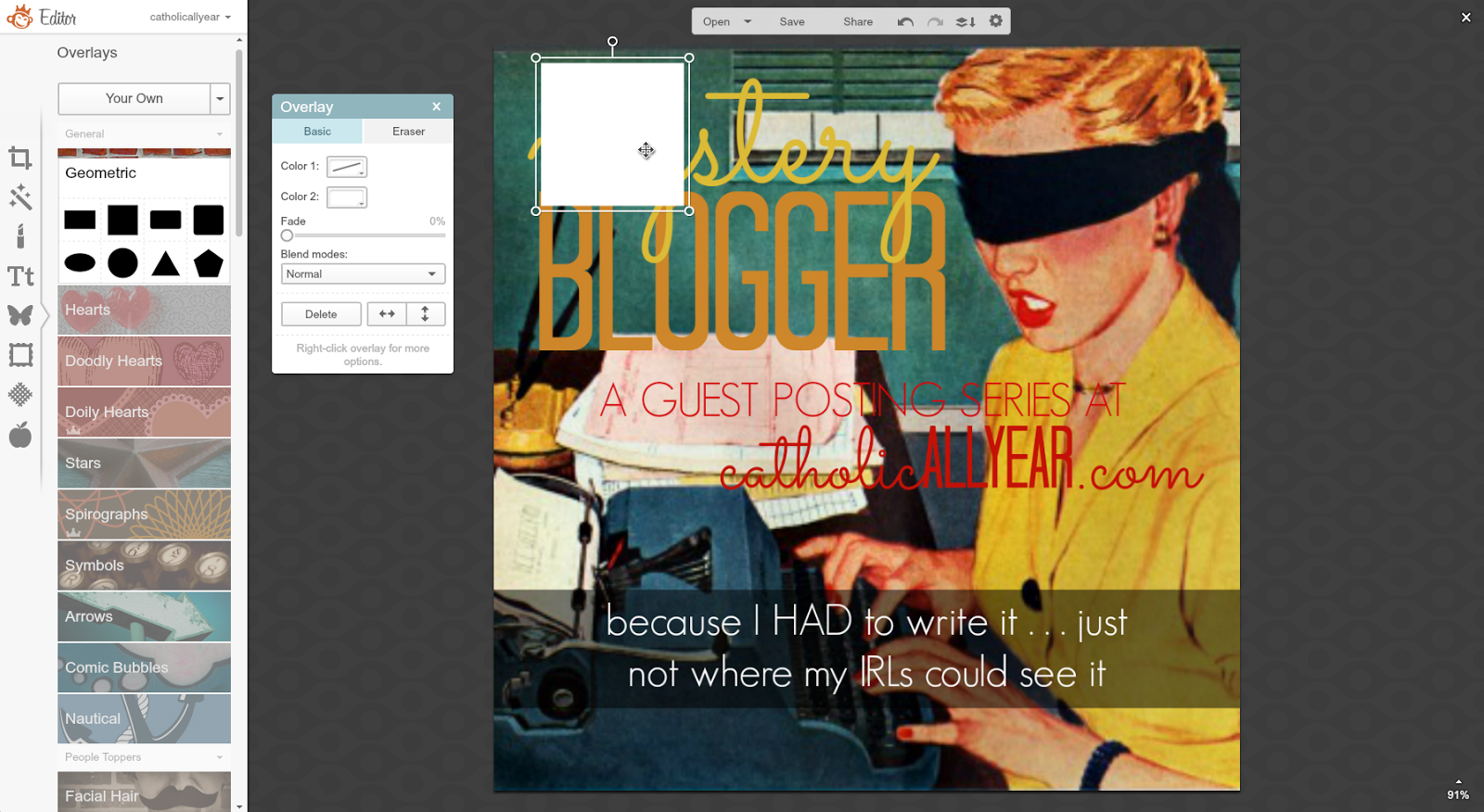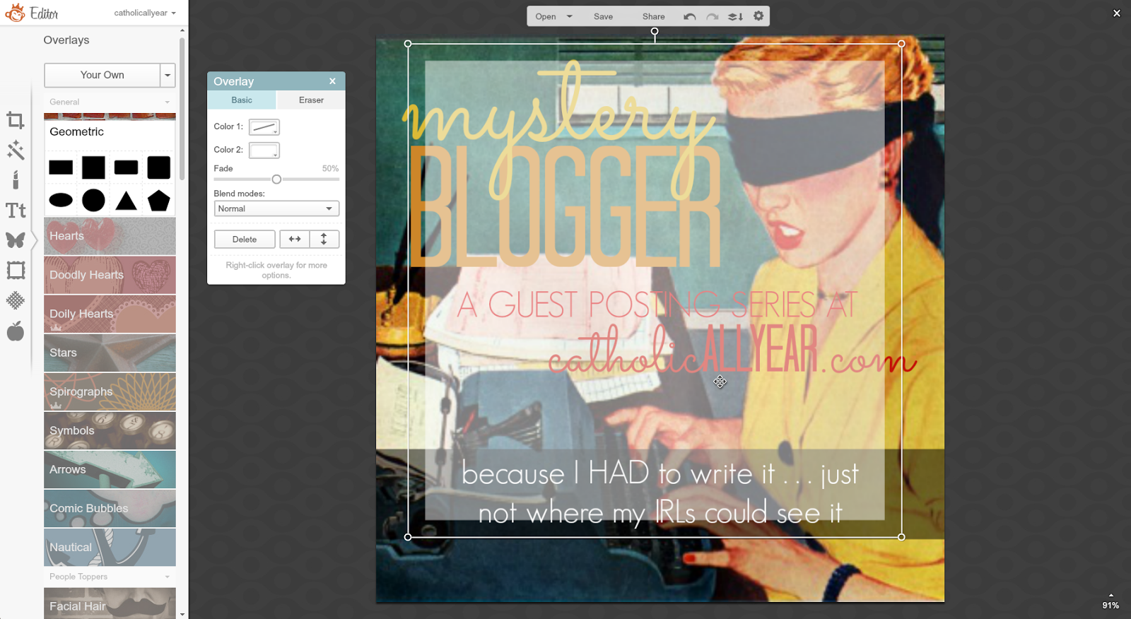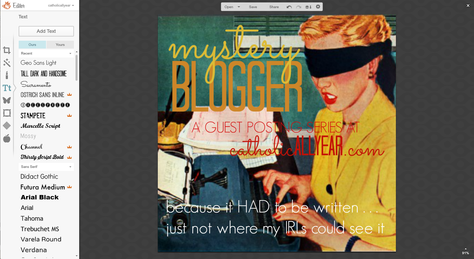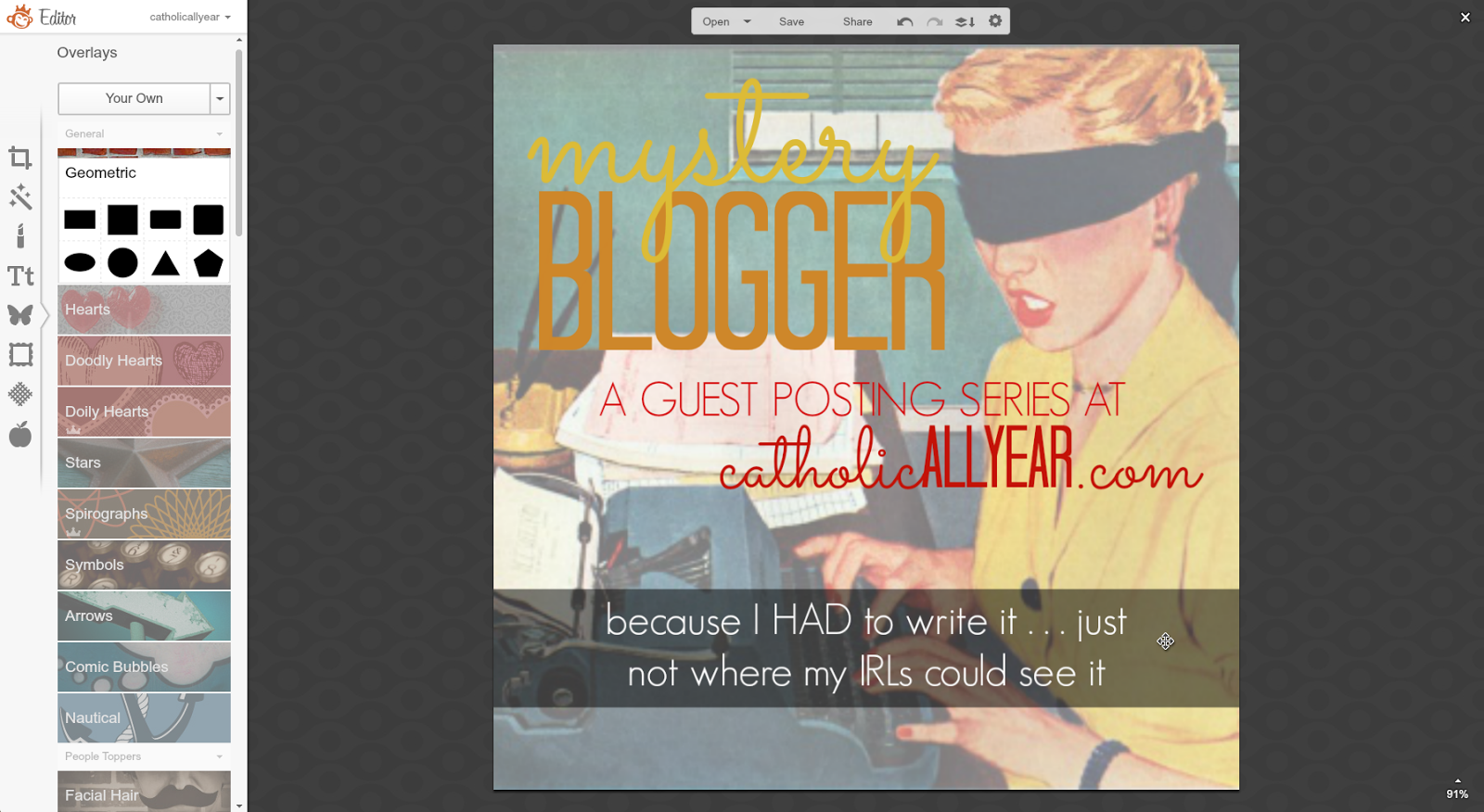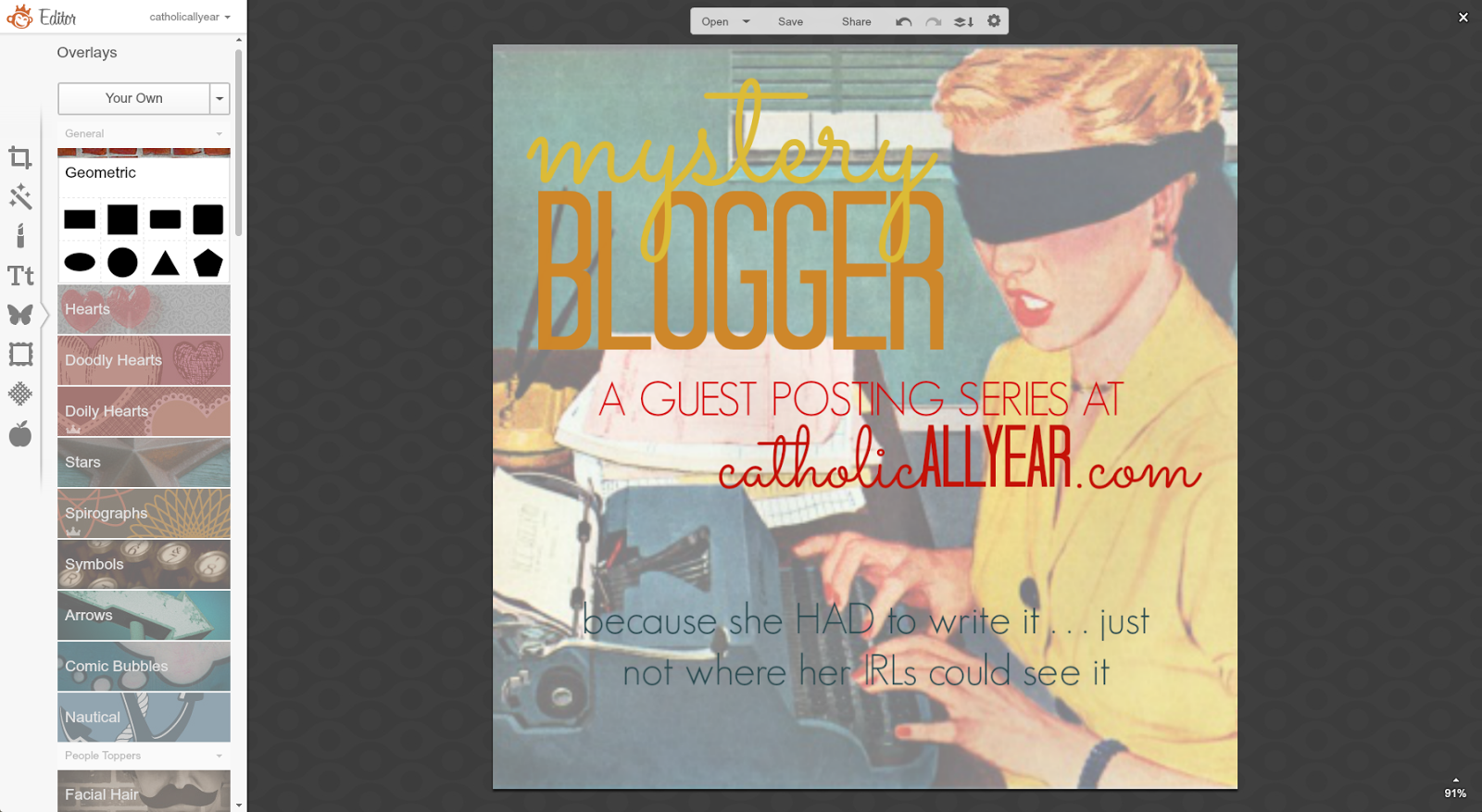 Hi, my name is Nancy, I blog at www.dosmallthingswithlove.com, and I am addicted to Pinterest traffic. As bloggers we all know that any sort of traffic is good--but I get about 80% of my traffic from Pinterest. Because of that traffic I have been able to turn my blog into a business that is actually contributing to my family financially right now. And here's the thing ladies, more Catholic Bloggers need to join me on Pinterest because it can be such a powerful way to share your content. There is only one social media network with the sole and absolute purpose of sharing content. Pinterest. Sure, more people use Twitter, but for all sort so reasons, only one of which is sharing content. Sure, Facebook is more personal, but with the constantly changing logarithms it often feels impossible to reach all of your followers. And so, it is time to give Pinterest another try. We do this through creating Pinnable Images. Before you tune me out hear this: Pinterest is used to share all sorts of content--not just recipes and crafts. In fact some of the all-time most popular pins have nothing to do with food or hot glue. No matter what you blog about you should be adding pinnable images to most of your posts. Not all of your posts (we'll cover this in a minute). Kendra has laid out exactly how to use PicMonkey to make your photos great. Now it's time to add just a few details to this so that your images can win on Pinterest as well. Before I dive in I just want to note that, as with all social media networks, there can be a lot of strategy that goes into using Pinterest as a blogger. I am not going to cover growing your pinterest following, group boards, rich pins, scheduling pins, switching to a business account or promoting pins. If you are serious about using pinterest to grow your blog I recommend googling these topics as the internet is rich with information on Pinterest. The following 10 tips will make your images "Pinnable"--and all of this can be done using PicMonkey.