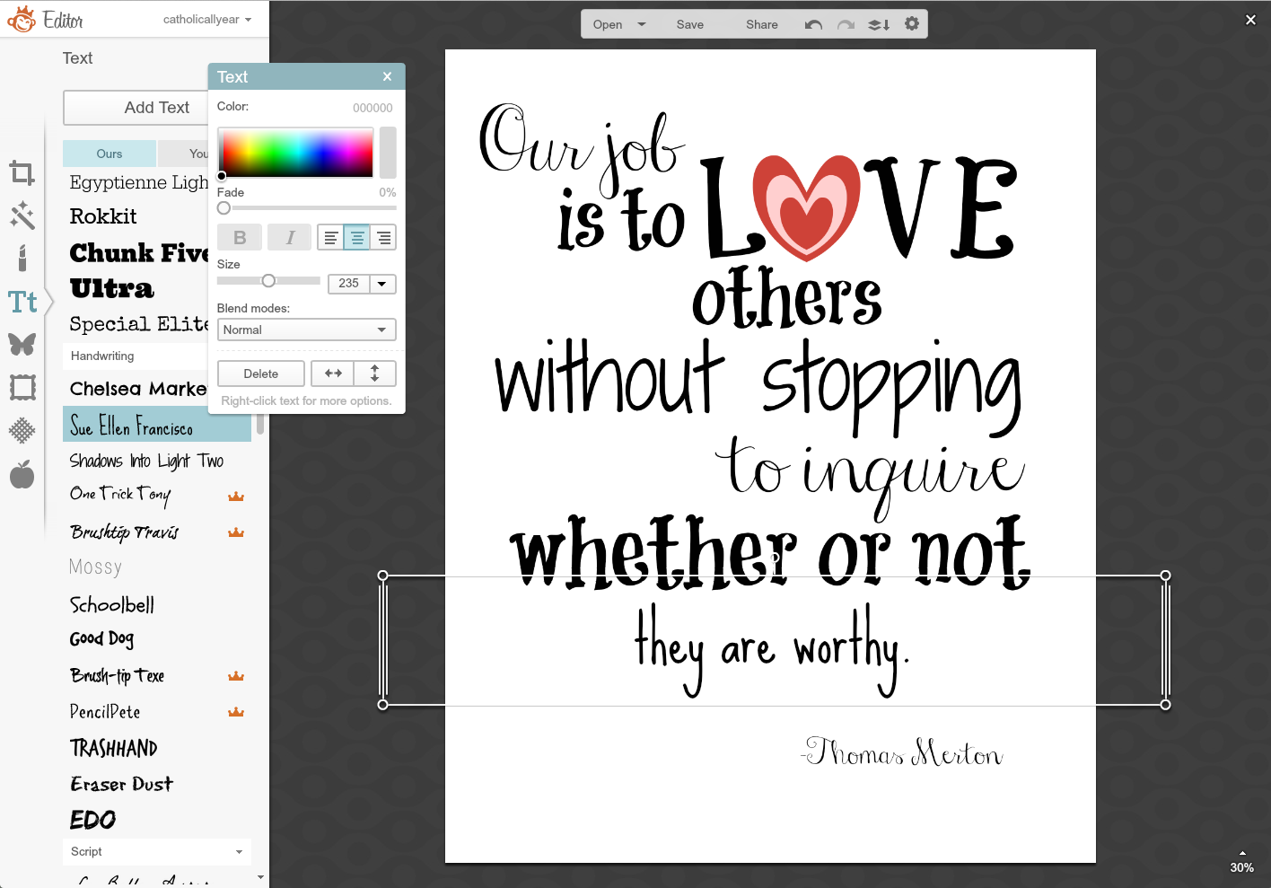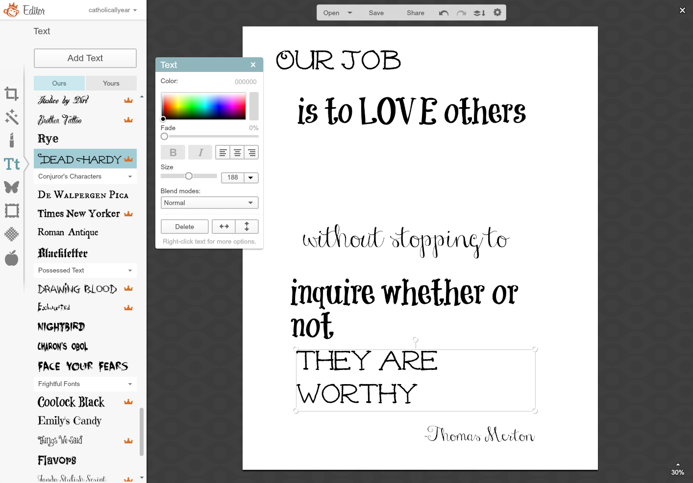 13. I ended up going with a different font entirely, adding more text to the version for the button, and adding my watermark for the printable prayers version. I moved the color spots off the image again and saved it and it's a done deal.