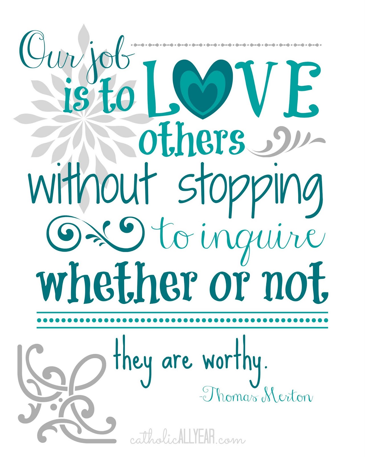 This one was a request from reader Theresa M, whose older brother is a novice entering the Abbey where Thomas Merton lived and is buried. Pretty. Awesome. She wanted it to look kinda like the Grace Before and After Meals prints I made, but be in teal or turquoise on a light background.