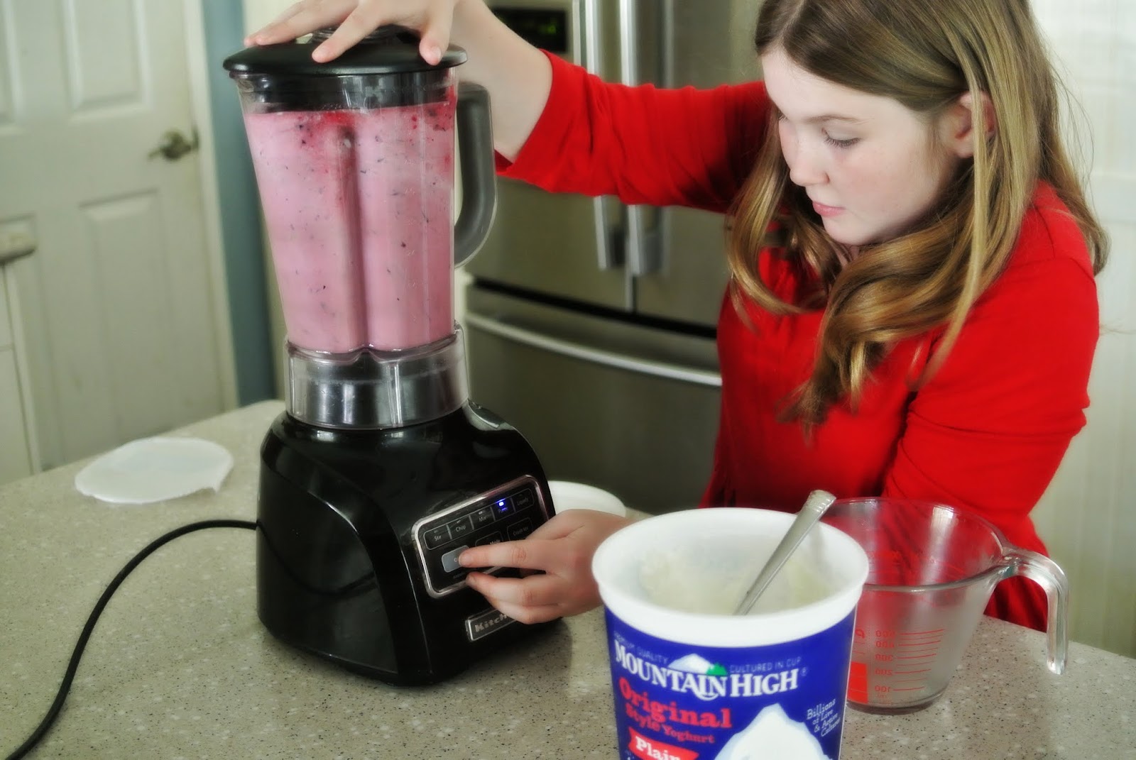 Scoop in yoghurt until the container is almost full, but not completely full, because there needs to be room for it to blend.